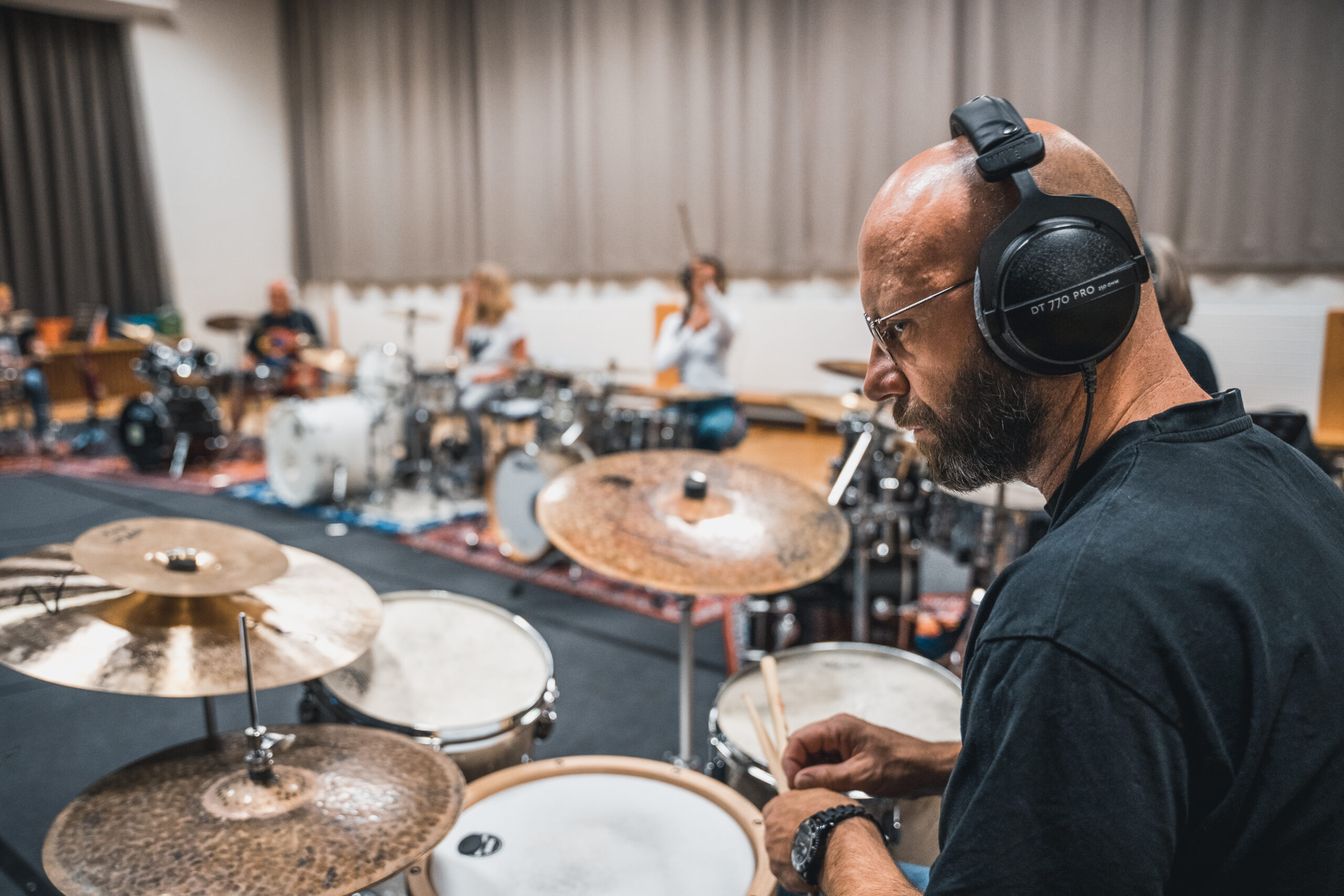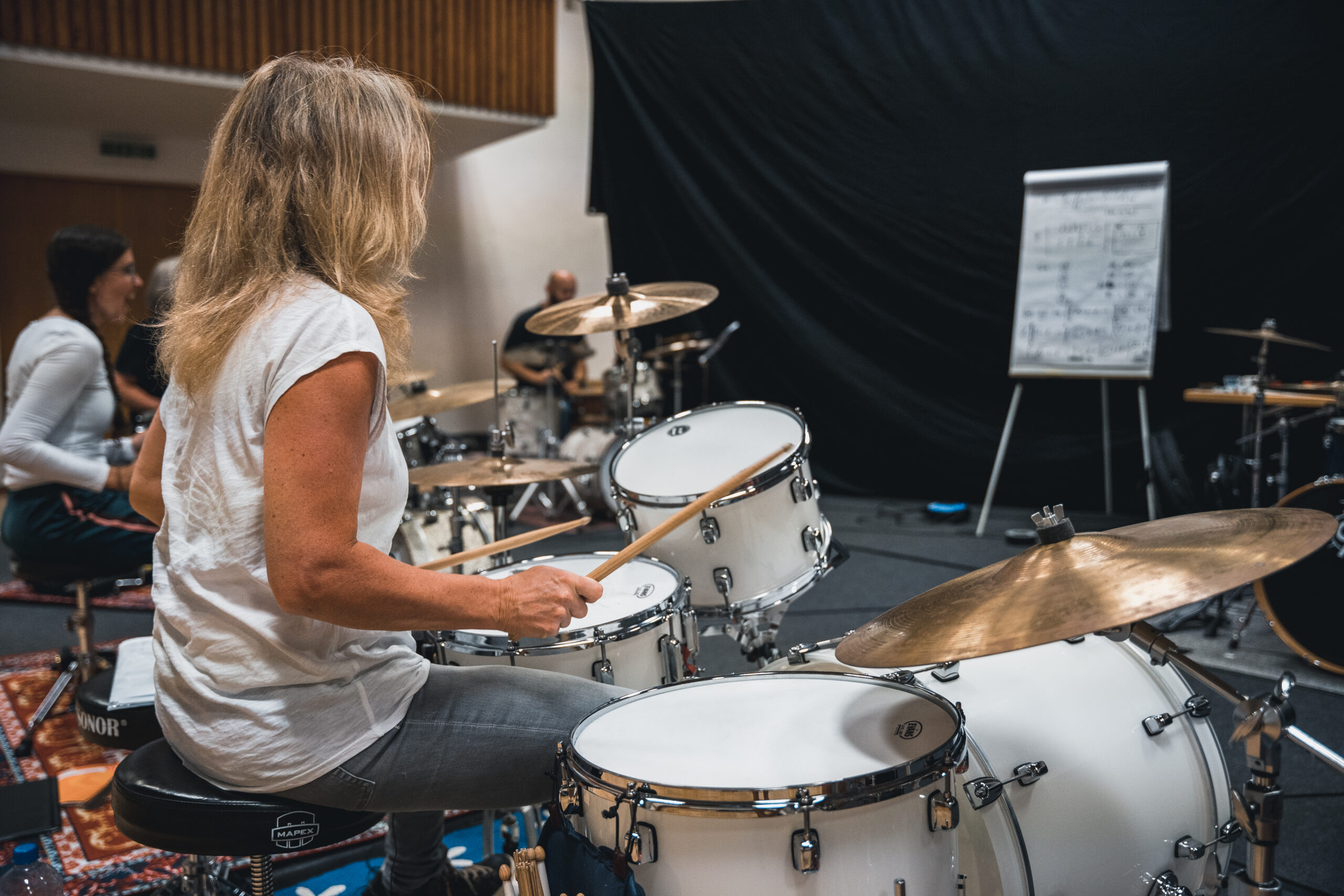 Mit individuell ausgewählten Playbacks arbeiten wir im SeminarSchritt für Schritt daran, das eigene Spiel zu schärfen, sowie musikalisch „in style“, band- und songdienlich zu gestalten. Zusätzlich zum Playback hilft das Zusammenspiel mit „Live“-Bass/Gitarre. Da innerhalb der Masterclass sehr unterschiedliche Stilrichtungen zusammengestellt werden, profitiert jeder Schlagzeuger jeweils von den anderen und erweitert damit ganz